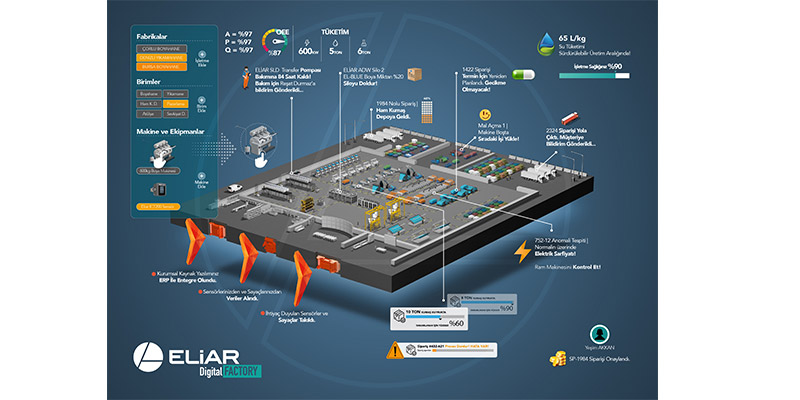 Eliar has developed the revolutionary “Eliar Digital Factory” within the scope of R&D and sustainability studies. With the “Digital Factory”, digital twins of textile facilities are formed and real-time product monitoring is carried out. In this way, businesses can analyze efficiency by instantly monitoring their carbon footprint and monitor their real-time costs.