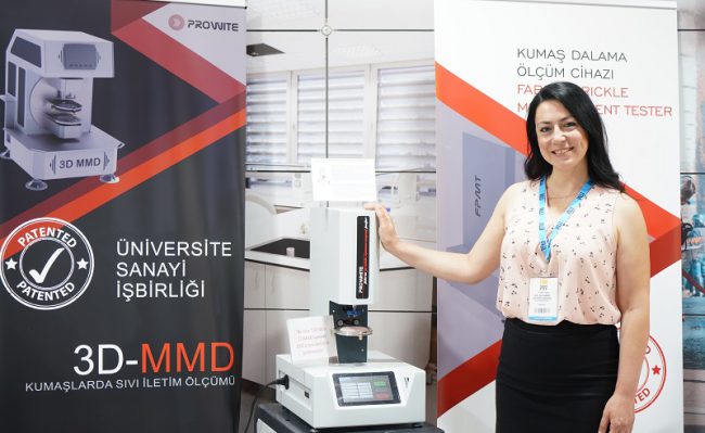 Kumaş Nem İletimi Ölçüm Cihazı kumaşların nem iletimine yönelik tüm özelliklerinin ölçümünde kullanılmak üzere tasarlandı. 3D-MMD ticari ismiyle sergilenen cihaz, termal kamera görüntüleme sistemlerinden yararlanarak, kumaş yüzeyindeki ıslanma bölgelerinin ayrıntılı olarak incelenmesini sağlıyor. Ölçümler, ortamdaki ışık ya da kullandığınız maddenin çeşitli özelliklerinden kesinlikle etkilenmiyor.Termal kamera görüntüleme sistemleri yüzey sıcaklıklarındaki farklılıkları algılamaya dayalı bir prensip ile çalışıyor. Böylelikle ölçüm, kumaşın deseninden, yüzey özelliklerinden, şardonlanmasından, tüylülüğünden, koyu renk olup olmamasından etkilenmiyor. Ayrıca dünyada bu alanda en detaylı inceleme yapabilen ilk cihaz olma niteliği taşıyor ve 3 boyutlu olarak teri simüle eden test sıvısının kumaş yüzeyi ve arka yüzde ne kadar hızlı ilerlediğini, ne genişlikte bir alana yayıldığını ve ne kadar hızlı kuruduğunu test edebiliyor.